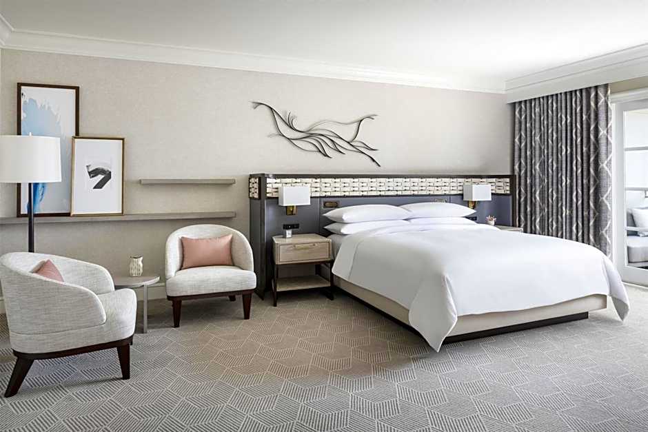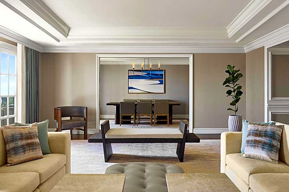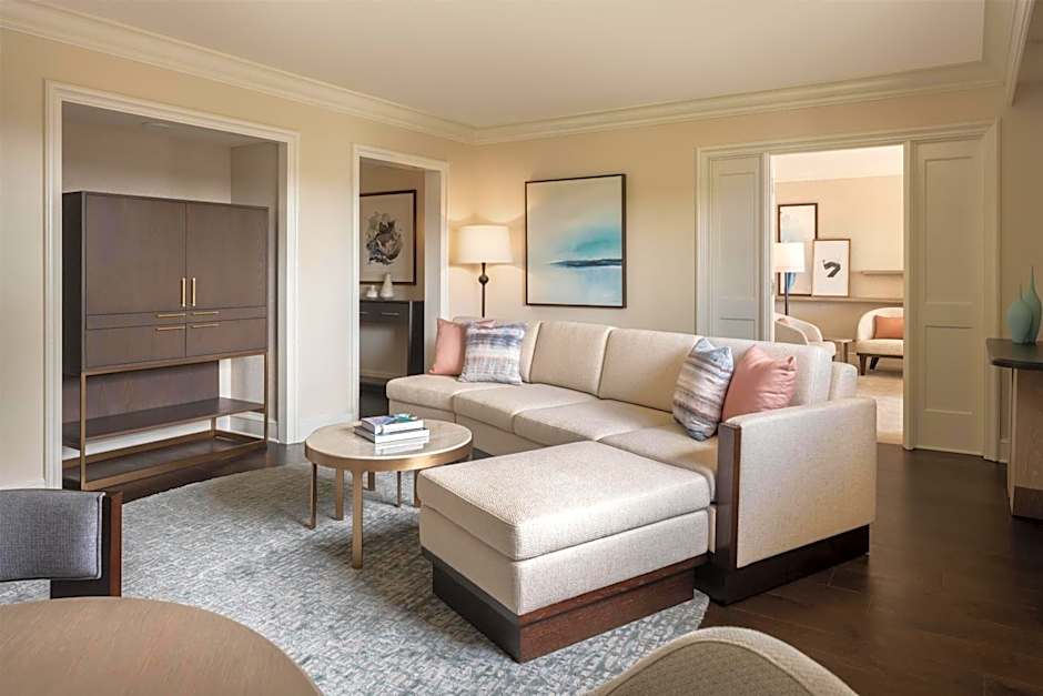 Offering a balcony with sliding french doors, this room comes with a furnished sitting area and a 55" LED smart TV. A deep soaking tub, glass-enclosed shower, and dual vanity sinks are featured in the marble bathroom.